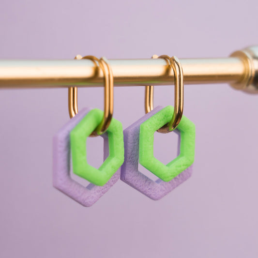 Creolen "Hexa Bold" in Flieder & Neongrün - Hexagon