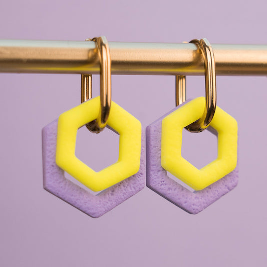 Creolen "Hexa Bold" in Flieder & Neongelb - Hexagon