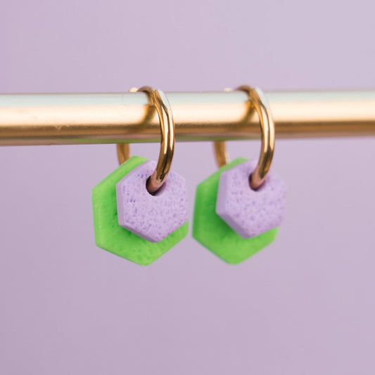 Creolen "Hexa Bold" in Flieder & Neongrün - Hexagon