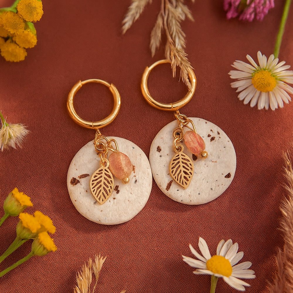 "Beige Brew“ - Diese handgefertigten Ohrringe vereinen minimalistisches Design mit einer besonderen Note. Die runden Anhänger in natürlichem Beige sind mit echtem Kaffee veredelt, was jedem Stück seine individuelle Maserung verleiht. Zarte goldene Blätter und ein schimmernder Naturstein setzen elegante Akzente und erinnern an die warme, belebende Wirkung einer frischen Tasse Kaffee.