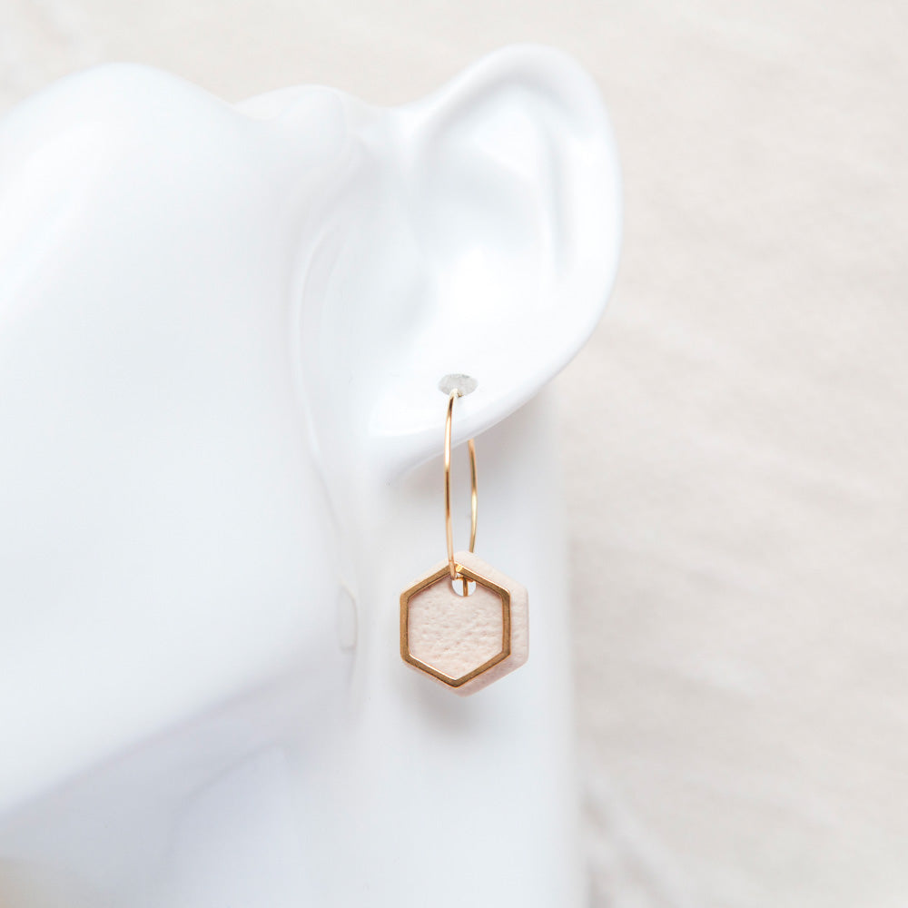 Die Ohrringe "Hexa" vereinen klare Linien mit einer warmen, goldenen Note – perfekt für die herbstliche Saison. Der feine goldene Creolenring trägt einen Anhänger in hexagonaler Form, die an die geometrische Strenge der Natur erinnert: wie Waben im Bienenstock oder kristalline Strukturen.
