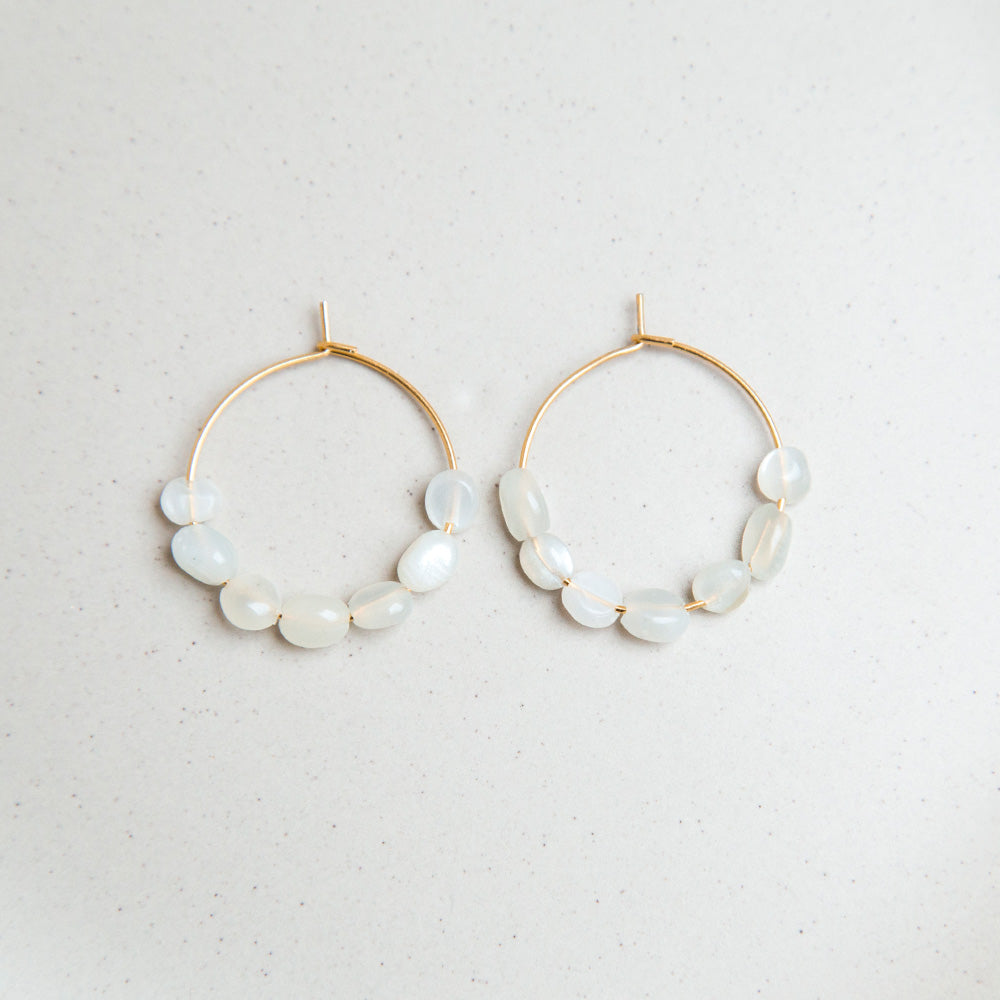 Feine goldene Creolen, geschmückt mit zarten Natursteinen, die in sanftem Licht schimmern und an den Glanz von Mondstein erinnern.