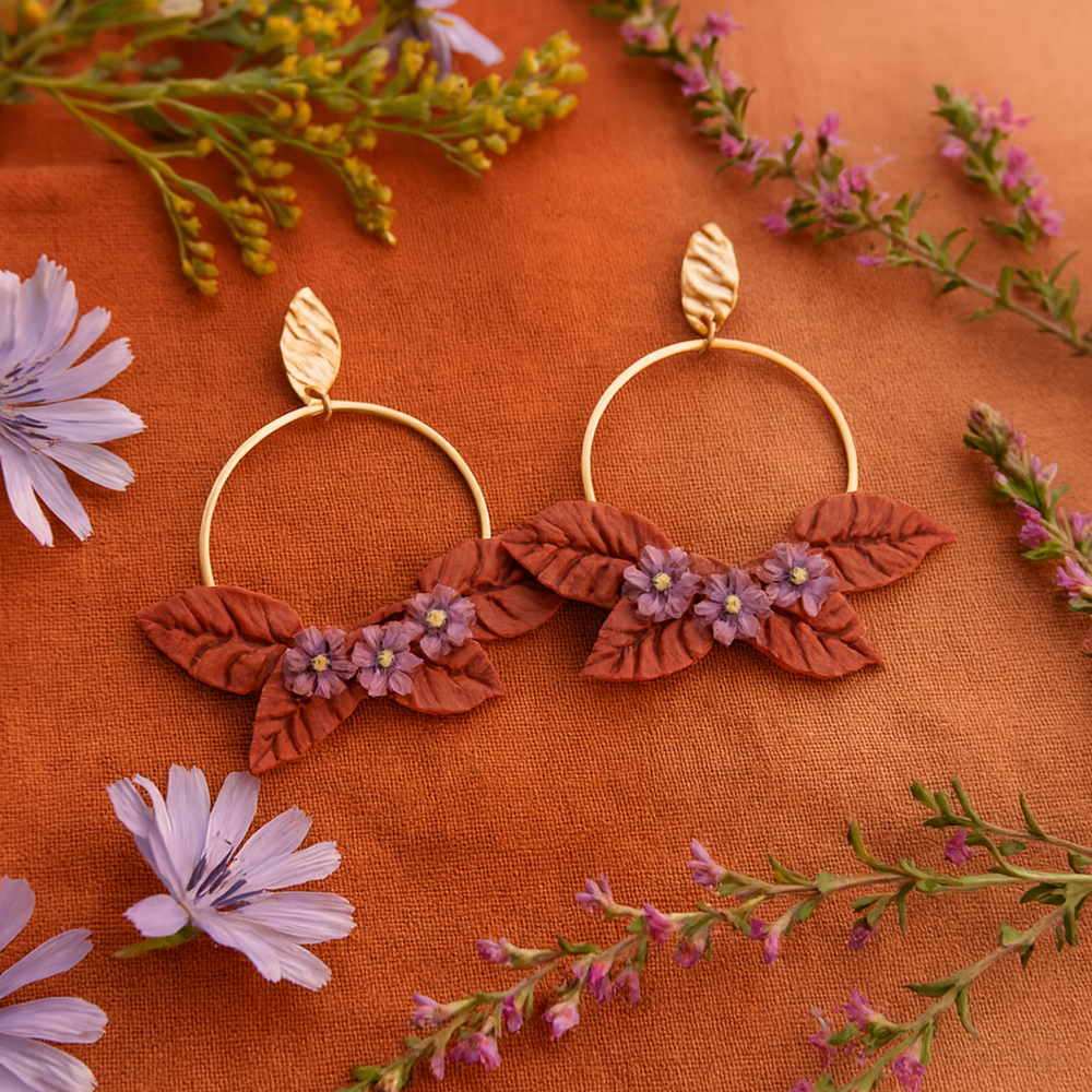 Diese verspielten Ohrringe erinnern an Laub, das im Herbstwind tanzt: Goldfarbene Elemente tragen filigrane Blätter in warmem Rot. und filigrane Blüten.