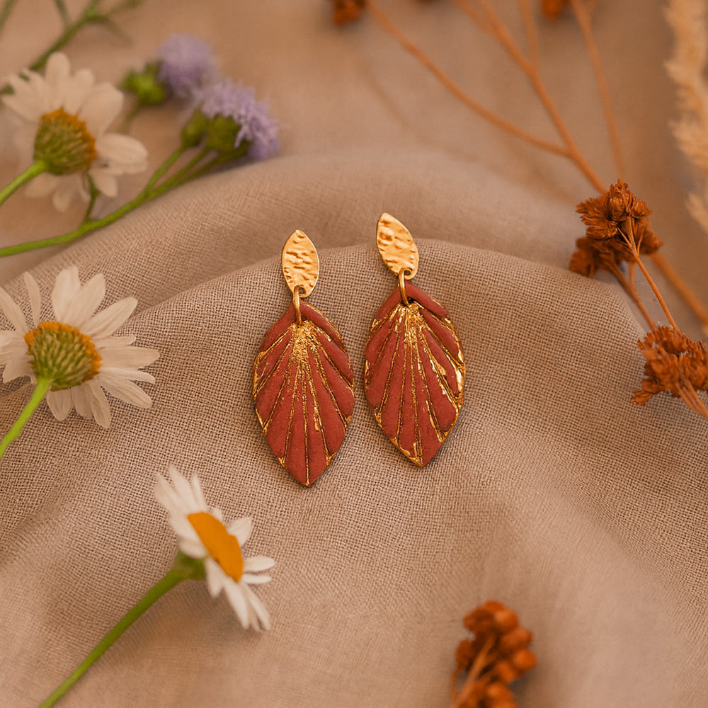 Diese handgefertigten Ohrringe vereinen Eleganz und Natürlichkeit in einem ausdrucksstarken Design. Die zarten Blattform-Anhänger in kräftigem Rostrot werden durch filigrane goldfarbenen Akzente veredelt, die das Licht auf wundervolle Weise einfangen. Der strukturierte Stecker rundet das Design ab und sorgt für eine edle, zugleich natürliche Ausstrahlung.