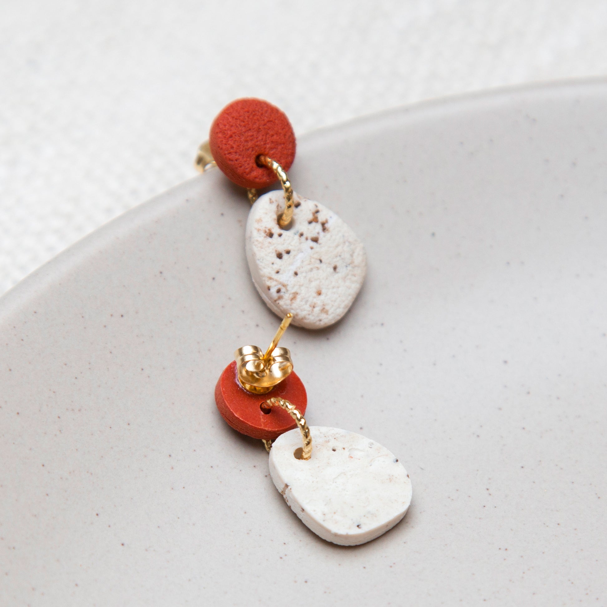 Die "Rust & Roast" Ohrringe bestehen aus zwei herbstlichen Elementen in rotbraun und einem beigefarben Element, in welches echter Kaffee eingearbeitet ist.
