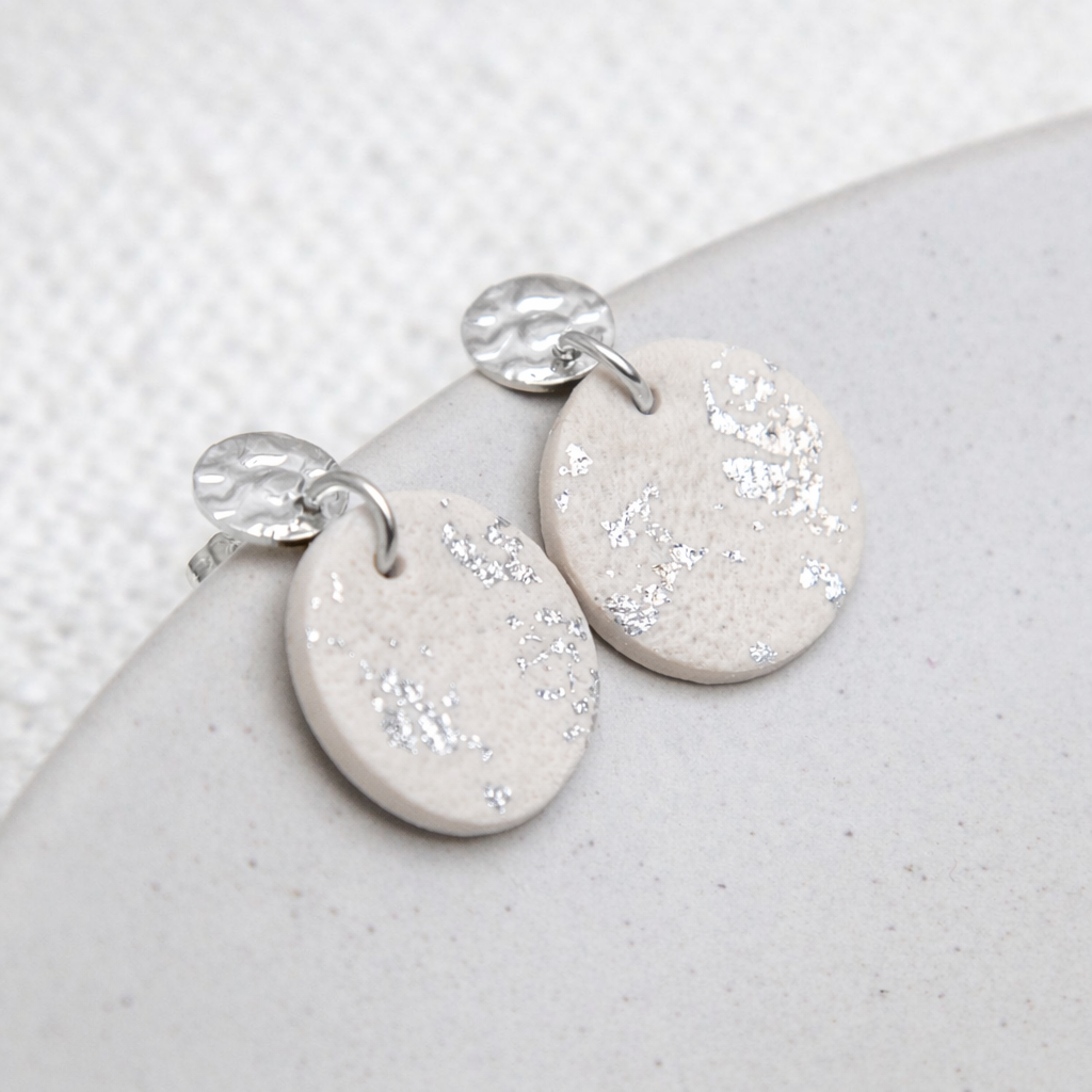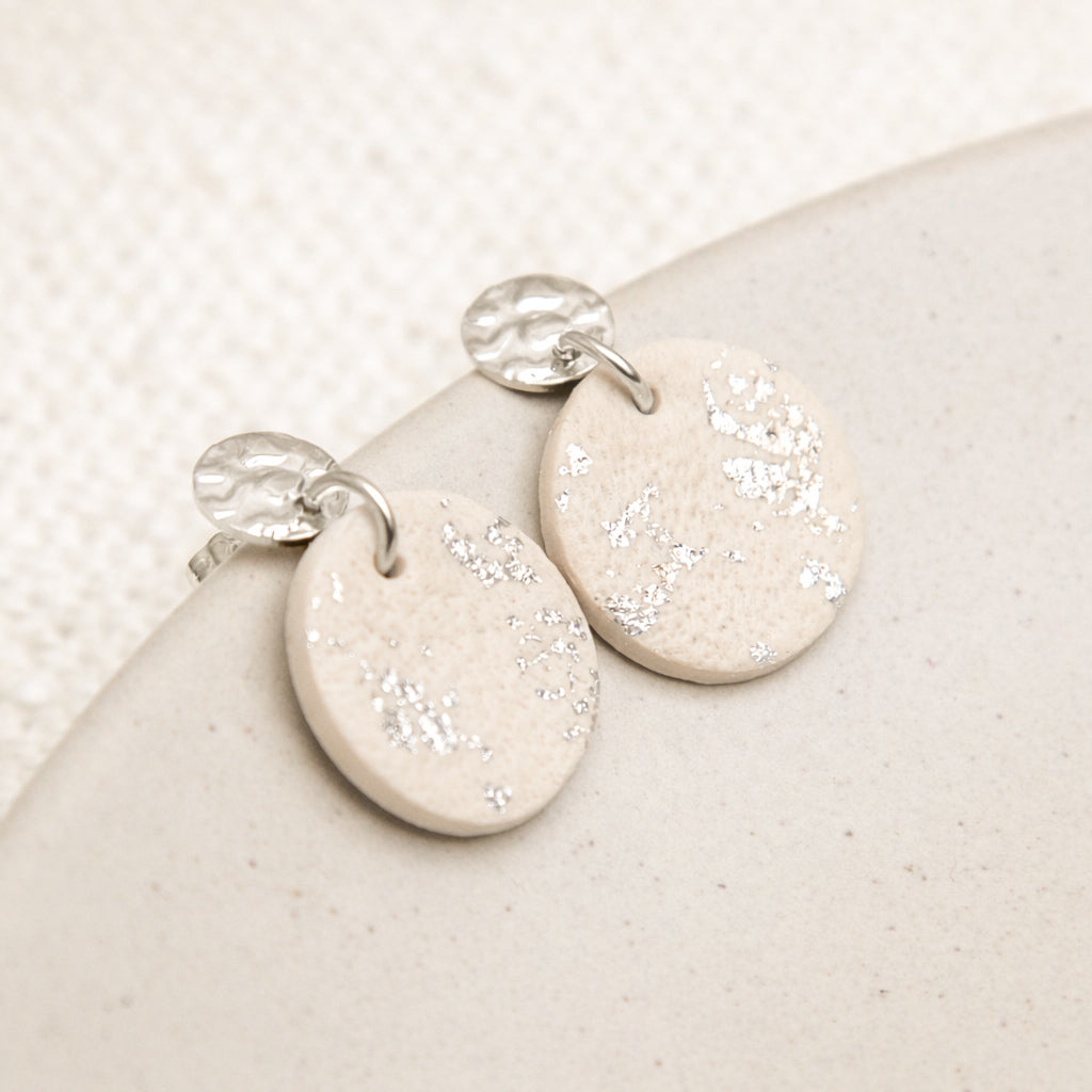 Ohrringe rund beige und silberfarben mit Stecker in Hammerschlag-Optik